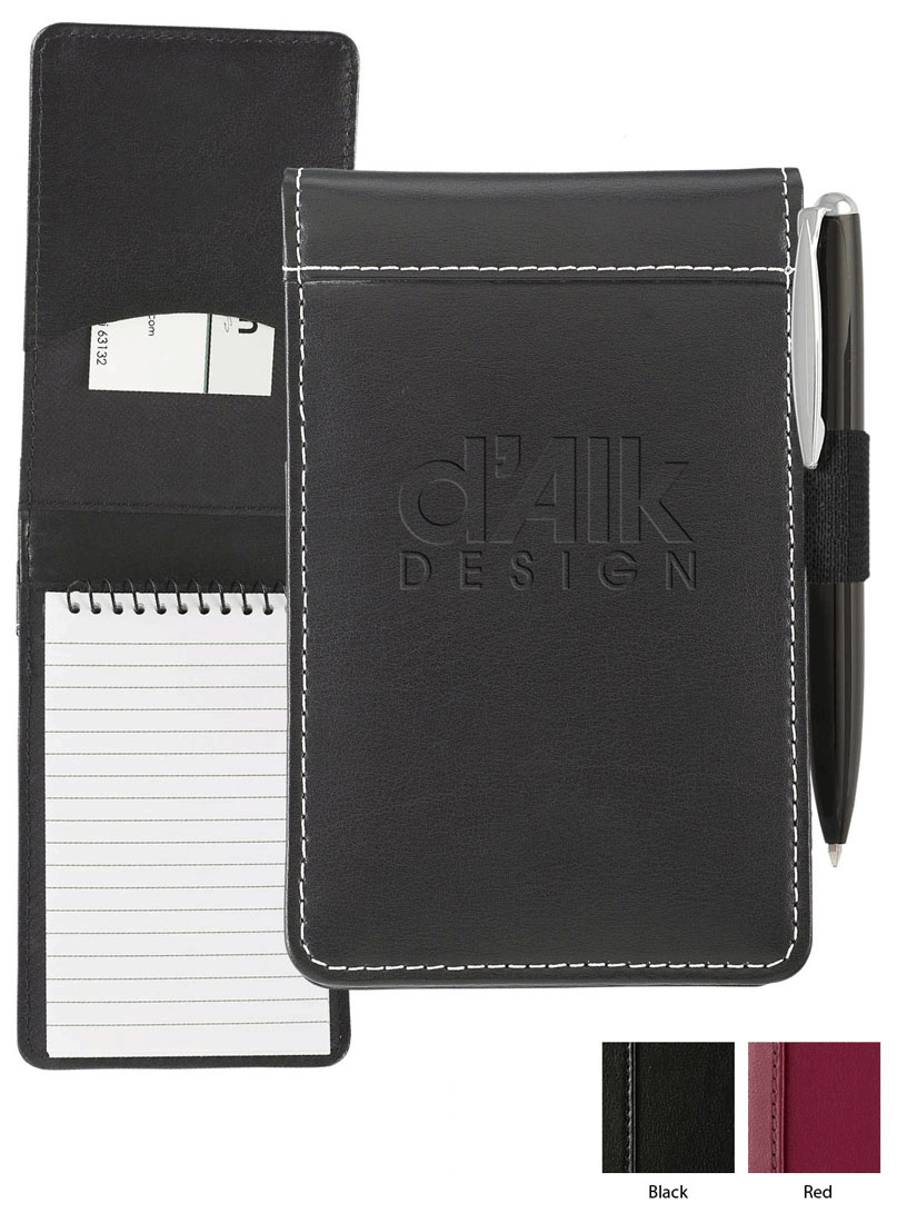 5 1/2" x 3 1/2" x 3/4". This jotter features stitched and padded bonded leather covers, with a fabric lining, and an inside card pocket. Elastic pen loop (no pen included). A 3" x 5" spiral pad is included.