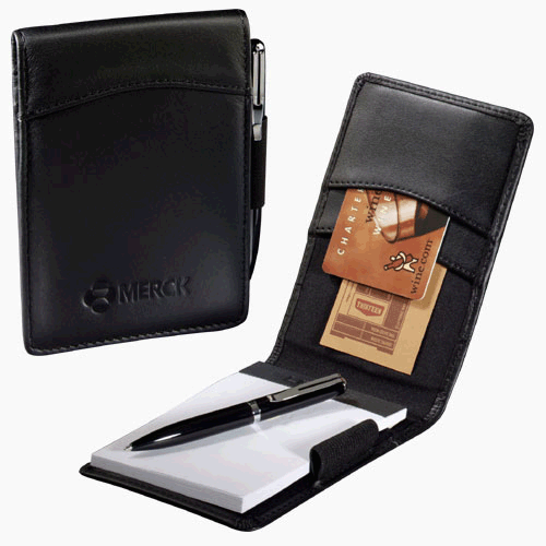 A gunmetal mini pen and a mini pad are included in this 4 1/2" x 3" x 1/2" note taker. Gusseted business card holder, plus an extra outside pocket. Refill mini pads are available. Made in black genuine leather.